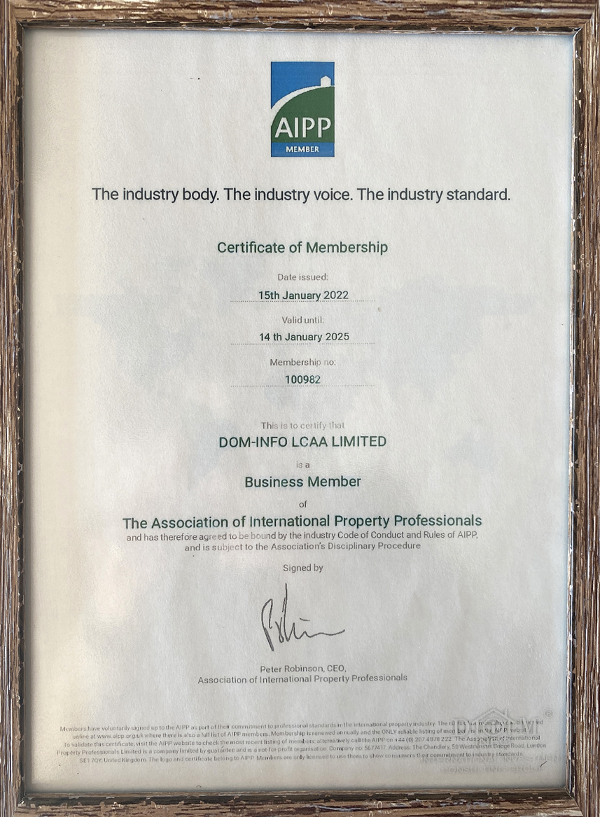 International certificate in the Association of Overseas Real Estate Professionals AIPP. AIPP Registration No. 100982